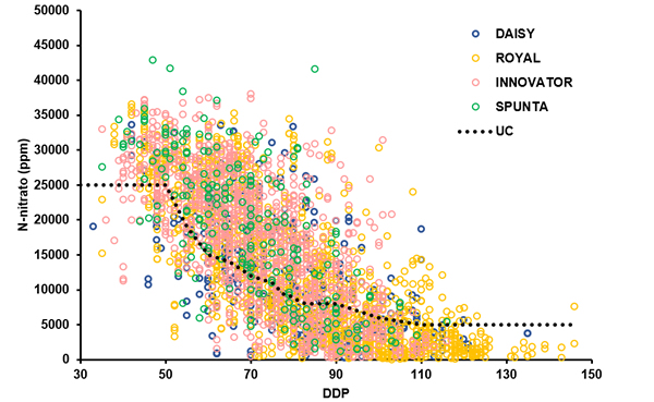 Figura 1. Contenido de N-nitrato en pecíolos de cultivo de papa en función de los días después de plantación (DDP). La curva de suficiencia (línea roja punteada) representa el umbral mínimo crítico (UC) para cada etapa del ciclo.