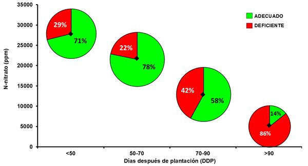 - La concentración de N-nitrato en pecíolos disminuye naturalmente con el avance del ciclo, pero muchos lotes caen antes de tiempo por debajo del umbral.