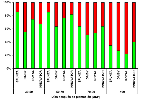 Figura 3. Evolución del porcentaje de muestras por encima (verde) y por debajo (rojo) del umbral crítico de N-nitrato según etapa del cultivo y variedad.